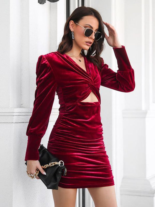 Women's Velvet Fitted Ruched Mini Dress With Front Cut Out Detail