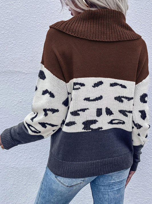 Women's Round Neck Colour Contract Jumper With Leopard Print Detail