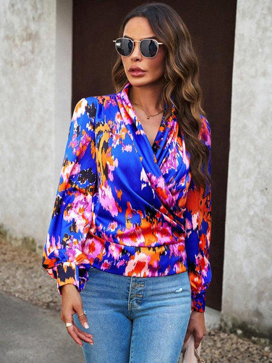 Women's Colourful Print Wrap Satin Long Sleeve Top