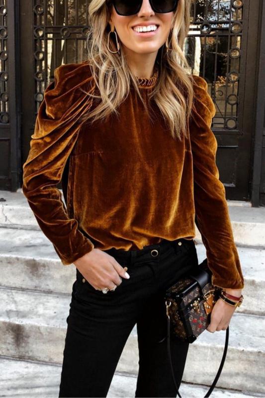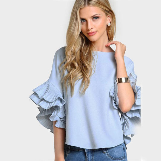 Women's Fitted Round Neck Top With Long Ruffle Sleeves