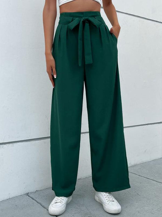 Women's Dark Green Tie Waist Wide Leg Trousers